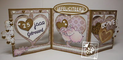 Aan de beide zijkanten heb ik het stencil met de kleine hartjes verwerkt. Deze heb ik voor beide kanten 2x gestanst uit wit cardstock linnen structuur, deze heb ik aan de voor en achterkant van de kaart geplakt, zodat het precies op elkaar valt. Dan zit het ook steviger vast aan de kaart. Ik heb het ook nog met Kraft Papier gestanst, zodat ik de kleine hartjes zo om en om erin kon plakken. Verder heb ik de witte en bruine kleine hartjes die uit het stencil komen, ook nog verder op de kaart verwerkt. De tekst jaar komt van de Clear Stamps School, de tekst Getrouwd komt van de Clear Stamps Banners en de cijfers 25 komt van het stencil Mery's Numbers. Verder heb ik links onder, nog het kleine varkentje erop verwerkt.