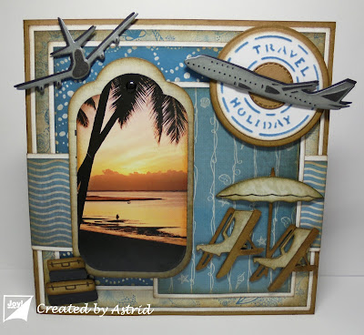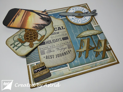 Vandaag een vakantie kaart om te laten zien. Ik heb hier gebruik gemaakt met het mooie papier van de Papierset Under the Sea. Heerlijk om op vakantie te gaan en wat is er nu makkelijker om met het vliegtuig te gaan. Je bent er dan ook veel sneller. De vliegtuigen komen van een wat ouder stencil Travel. Onder het rechtse vliegtuig nog een stencil met Travel/Holiday gebruikt van een ook wat ouder stencil Travel. In het midden daarvan, nog een Cirkel van het Basic stencil gebruikt, met de mooie stiksteekjes.
