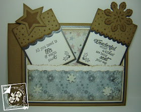 Het achterste gedeelte (21 cm x 14,5 cm) van de kaart is wat groter dan de voorkant, vandaar dat ik het linker gedeelte op 2,5 cm heb gerild. Dat is dan ook gelijk de plaklijn. Zo kan de kaart dan ook makkelijk blijven staan. Ik heb twee verschillende vellen van het paper block Shabby Christmas gebruikt en de bovenste helemaal vast geplakt en het onderste gedeelte aan de bovenkant open gehouden, zodat je er tags in kan schuiven. Op het onderste gedeelte van het papier heb ik nog een oude stencil cutting & embossing (sterren) rand 7 gebruikt en deze erop geplakt. Als je goed kijkt, kun je aan de rechterkant ook nog zien, dat ik de nieuwe stempel van Clear stamps/stencil Christmas Candle een rand heb gestempeld met de kerst hulst blaadjes.