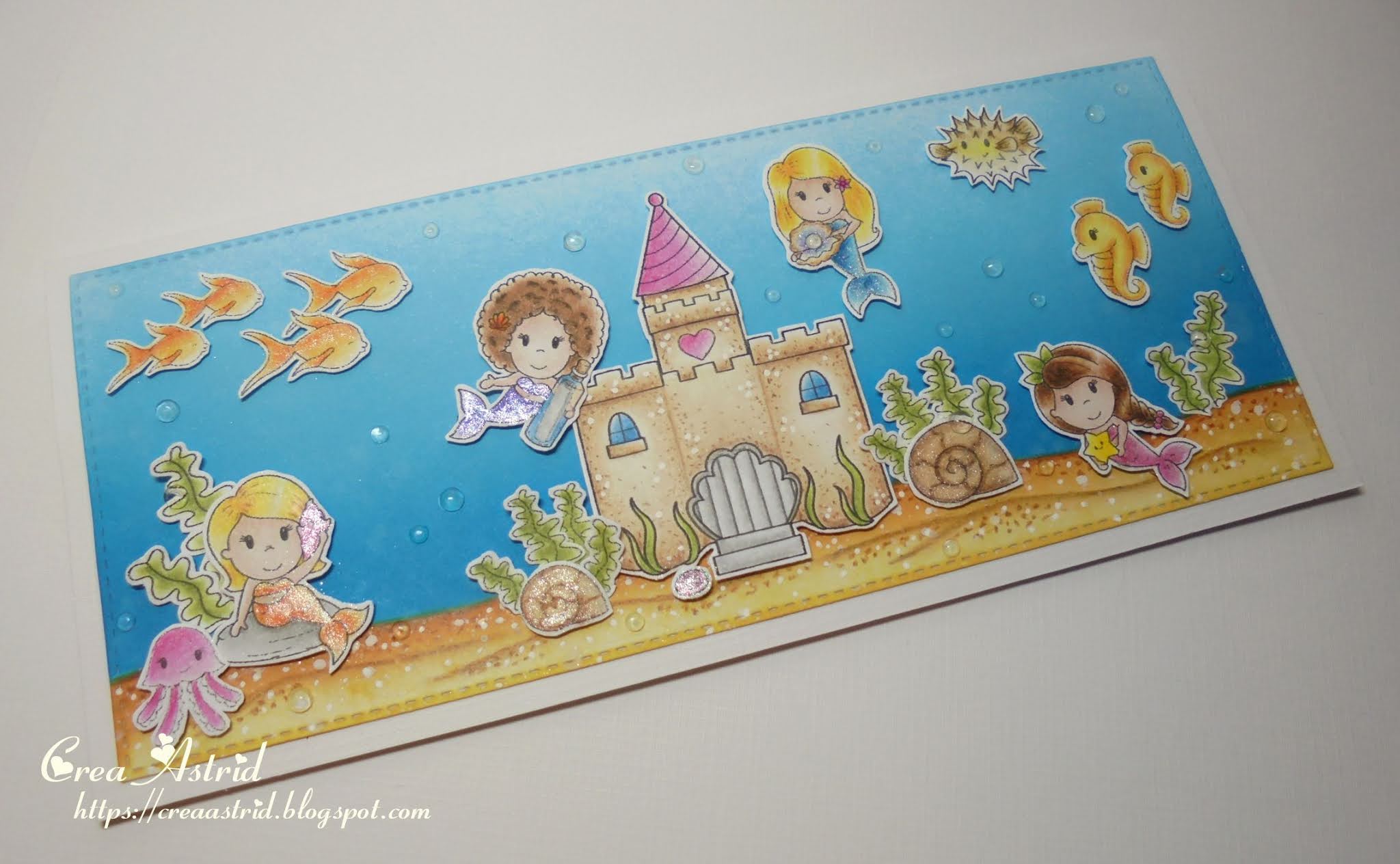 De 10e van de maand is weer de nieuwe Challenge van start gegaan bij Kleuren met potloden. Ik heb een slimline kaart gemaakt, met de onderwater wereld digi's van The Paper Nest Dolls - Mermaid set. Alle digi's heb ik van deze mooie set gebruikt. Eerst heb ik de achtergrond met Distress Ink bewerkt (water en zand) en daarna wat waterdruppels op gespetterd en droog gedept. Helaas zie je dat met zoveel dingen op de kaart, nu minder goed. Maar in het echt is het wel beter te zien. Op het zand nog wat druppels met een kwastje met witte Gesso gedaan. Op het kasteel nog wat witte accentjes met de Uni Posca pen aangebracht. Dan alles uitknippen en een plaatsje geven. Daar ben je dan toch wel even mee bezig. Het zijn ook best aardig wat kleine afbeeldingen en eer dat je die allemaal uitgeknipt hebt. Dan weer een aantal keren verleggen, wat als ik het dan daar doe, of als ik het nu zo doe, je kent het wel. Dan ben je inmiddels een paar uur verder. Hihi.