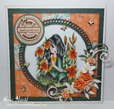 Vandaag wil ik jullie een kaart laten zien, die ik heb gemaakt voor Kleuren met potloden. Ik ben aan de slag gegaan met de mooie digi van Colour of Love - Rory Stargazers. De sketch die ik heb gebruikt, is van het blog van Cheerful Sketches. Twee verschillende Designpads van Craft Sensations met elkaar gecombineerd. Verschillende mallen gebruikt en wat bloemen en houten vlinders erop verwerkt.